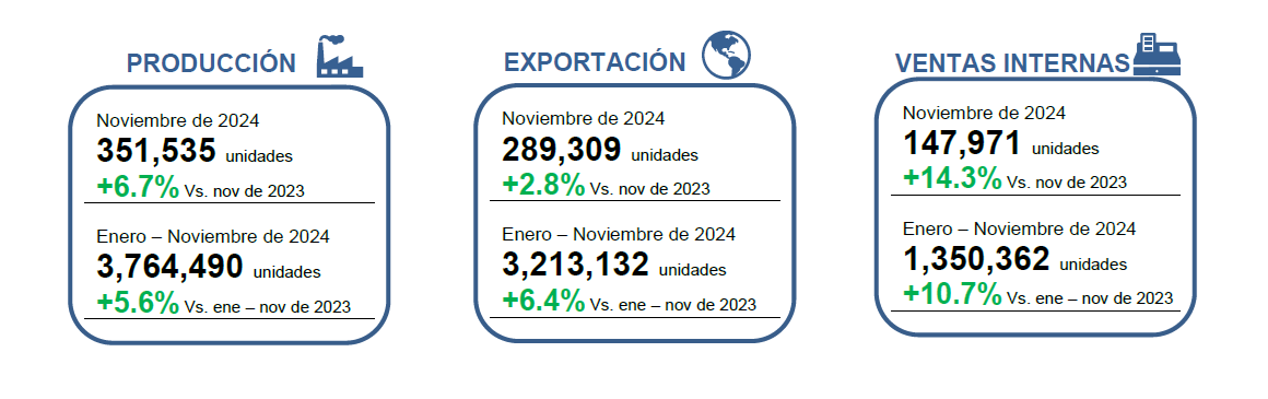 En cuanto a exportaciones, noviembre pasado también se posicionó como el segundo mejor registro para un noviembre con 289,309 unidades, superado únicamente por noviembre de 2018. En el acumulado de enero a noviembre de 2024, se lograron cifras récord en producción, con más de 3.76 millones de unidades, y exportaciones, con más de 3.21 millones.