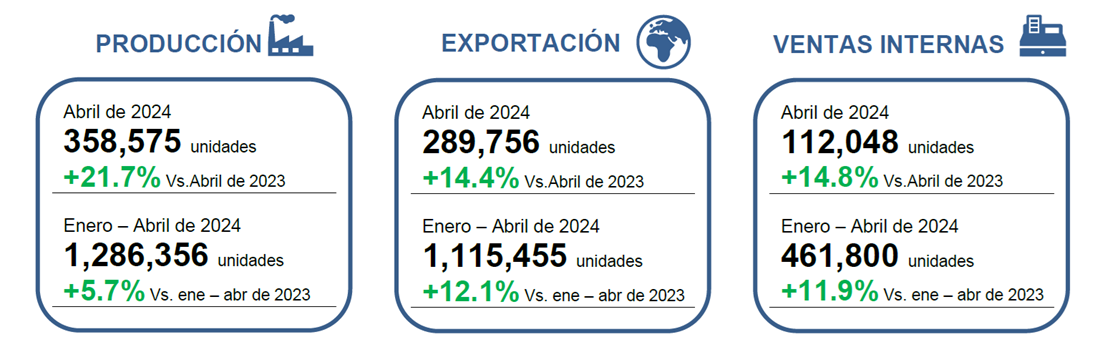 En abril de este año se produjeron 358,575 unidades, lo que representa un crecimiento del 21.7% en comparación con las cifras reportadas para el mismo mes de 2023, y un crecimiento del 5.7% para las cifras acumuladas de enero a abril de 2024.