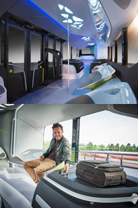 El compartimento de pasajeros de la plataforma tecnológica contrasta con el layout habitual del interior de un autobús de este tipo. El tema básico del diseño son los espacios públicos abiertos, como plazas o parques, y no se asume la disposición acostumbrada de un autobús urbano. Las fronteras entre el interior y el exterior se difuminan. El diseño del autobús lo mimetiza con su entorno, con el que configura una unidad.