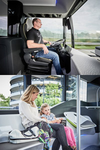 El conductor del autobús urbano del mañana toma asiento ante un puesto de conducción no menos futurista. Su entorno de trabajo se distingue radicalmente del diseño habitual en los autobuses urbanos del año 2016. Por ejemplo, en el Mercedes-Benz Future Bus se renuncia a una separación física de la cabina para el conductor.