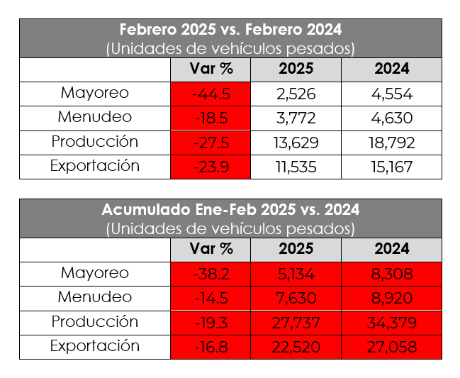 Al concluir el segundo mes del año, se reportan disminuciones en las ventas al mayoreo de vehículos pesados de 44.5% al totalizar en 2 mil 526 unidades; por otra parte, la disminución en el acumulado bimestral fue de 38.2%, con ventas de 5 mil 134 vehículos de carga y pasaje, informó la Asociación Nacional de Productores de Autobuses, Camiones y Tractocamiones (ANPACT).