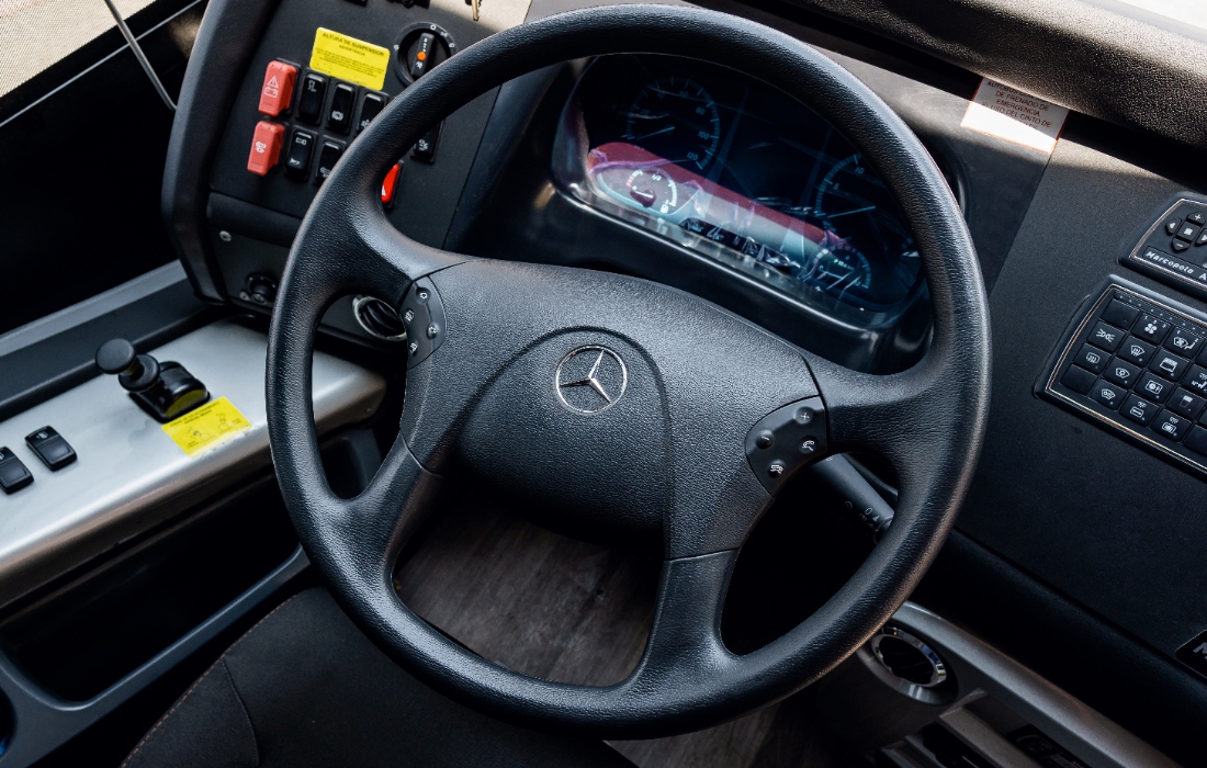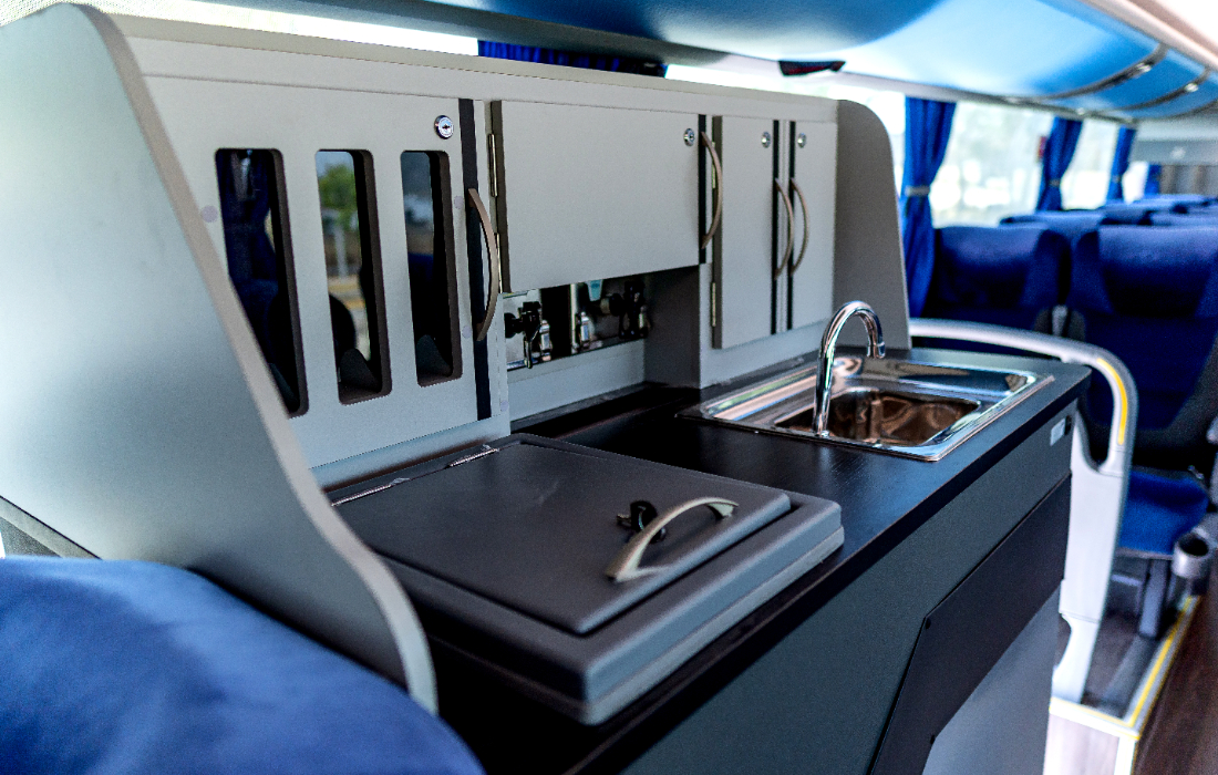 La imponente unidad está equipada con 46 asientos con descansa pies, cinturones de seguridad en primera fila delantera y central trasero, portavasos, USB, así como, equipo de climatización independiente para conductor y pasajeros, aire acondicionado, calefacción, un sanitario, camarote, cinco pantallas abatibles, mampara de separación con puerta corrediza, entre otros atributos.
