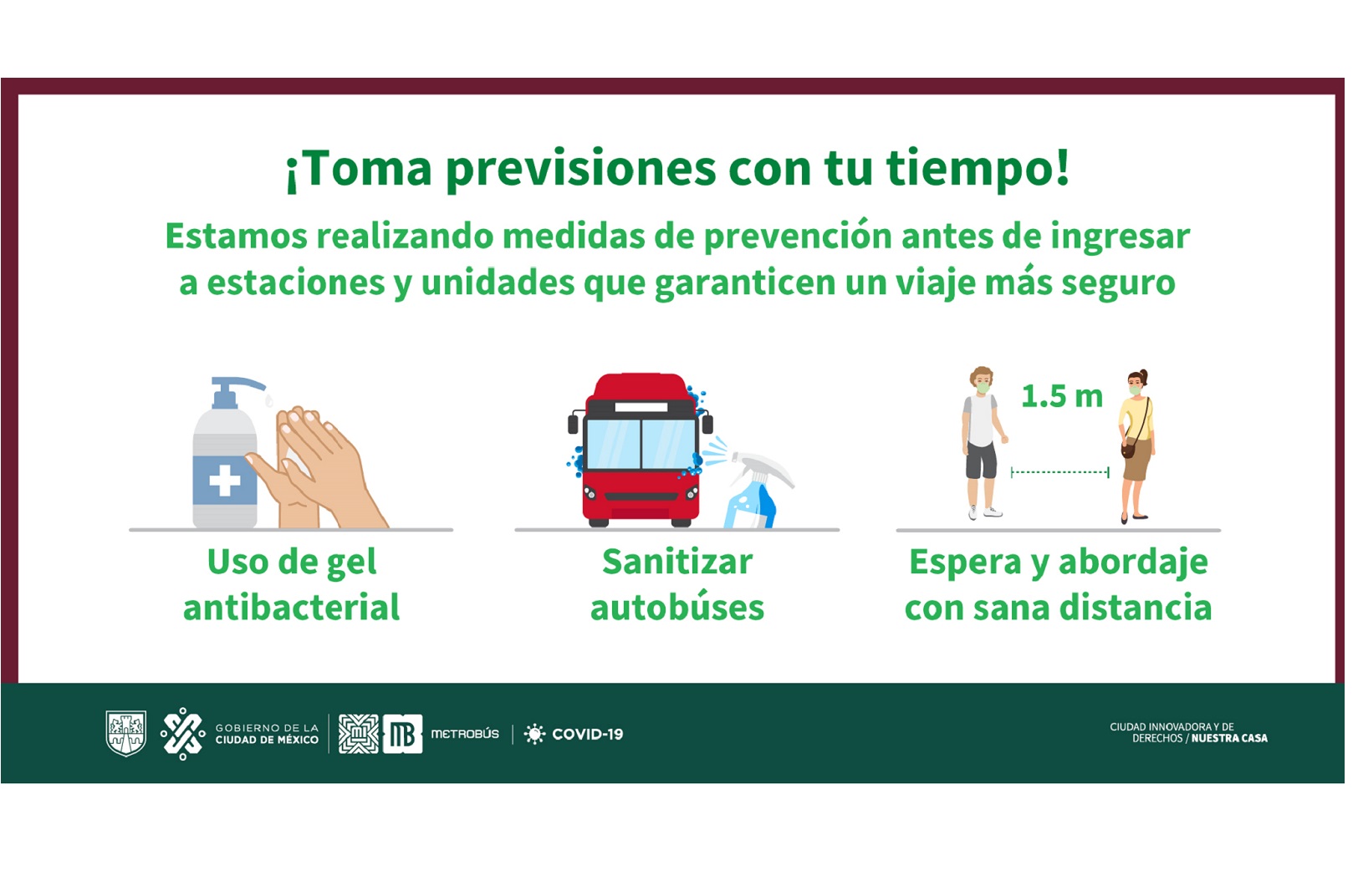Metrobús hace un atento y respetuoso llamado a la población usuaria a sumar esfuerzos para recalcular sus tiempos de trayecto, pues esta acción va a requerir contemplar los tiempos de espera, durante los cuales, en algunas estaciones, se realizará la toma de temperatura.