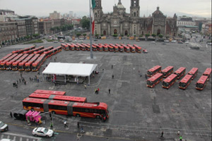 En la explanada del Zócalo de la CDMX, el mandatario capitalino puso en circulación 12 autobuses biarticulados que serán incorporados a la Línea 1 del Metrobús (Indios Verdes-El Caminero), cada unidad tiene 25 metros de longitud y una capacidad de 240 pasajeros.