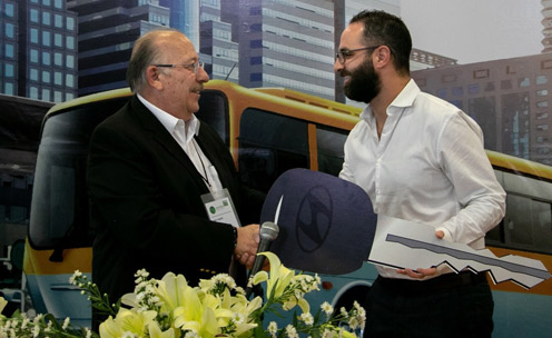 Elías Dana, Director de la División de Transporte de Pasajeros en Traxión, recibió de manos de Gino Saer, CEO de Hyundai Camiones y Buses México, una llave simbólica representando la entrega de las unidades equipadas con sistemas anticolisión, de geolocalización avanzada y de inteligencia artificial.