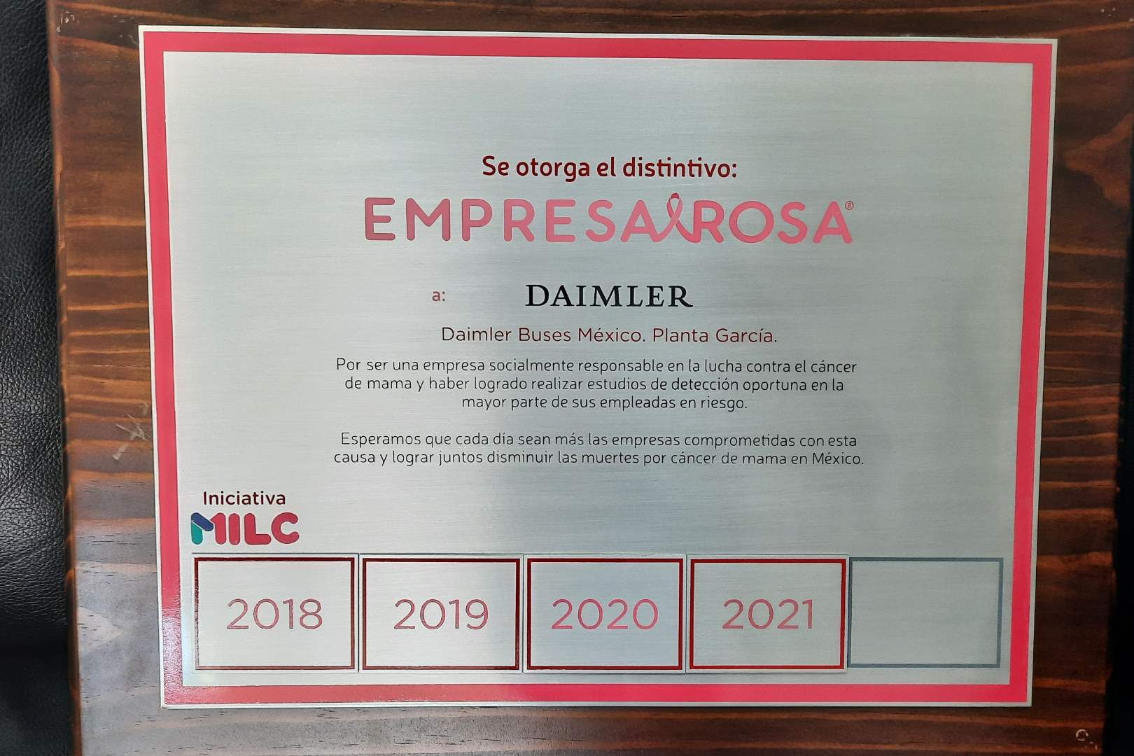 Mercedes-Benz Autobuses recibió por cuarto año consecutivo el Distintivo Empresa Rosa. Dicho reconocimiento es, otorgado por la Asociación de Médicos e Investigadores en la Lucha contra el Cáncer de Mama (MILC) a aquellas empresas o instituciones socialmente responsables que contribuyen a minimizar la mortalidad por cáncer de mama en México.