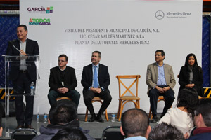 El alcalde de García, Nuevo León, César Valdés Martínez, y parte de su comitiva, se reunieron con Directivos de Daimler en la Planta de Mercedes-Benz Autobuses, con la finalidad de conocer el proceso de producción de las unidades que son fabricados con la más alta tecnología y cuidado al medio ambiente.