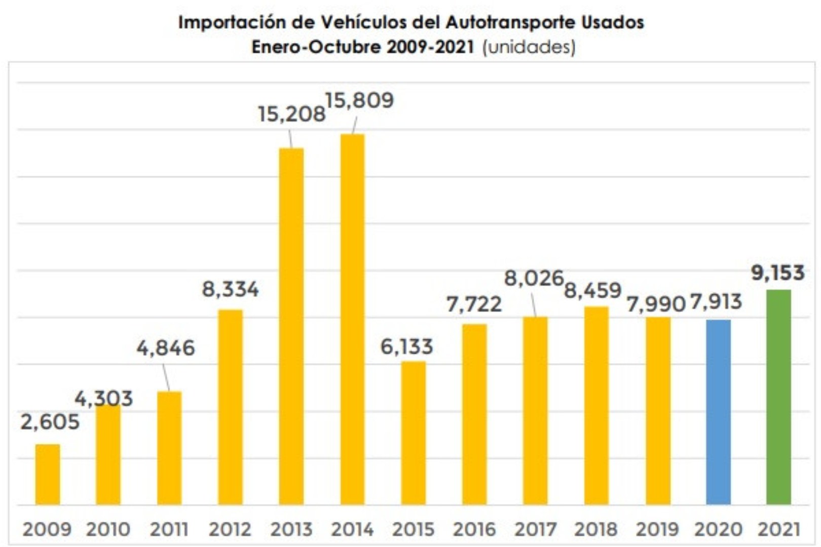 La Asociación Nacional de Productores de Autobuses, Camiones y Tractocamiones (ANPACT) informó que la importación acumulada de vehículos pesados usados de enero a octubre del 2021 alcanzó 9,153 unidades, que comparadas con las 7,913 importadas durante el mismo periodo del 2020, significan un crecimiento 15.7%.