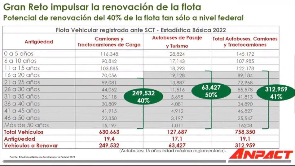 Precisó que el 40% de los autobuses, camiones y tractocamiones, tiene una antigüedad mayor a 20 años, “eso quiere decir que tenemos vehículos circulando en nuestras carreteras con 40 años de antigüedad, vehículos que son contaminantes, inseguros e improductivos”.