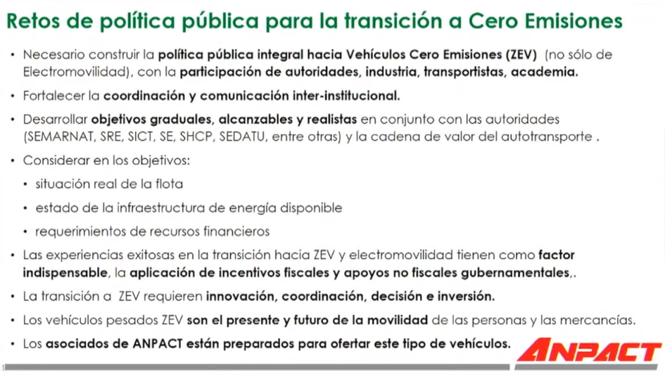 En su intervención, Alejandro Osorio, director de Comunicación y Asuntos Públicos de la Asociación Nacional de Productores de Autobuses, Camiones y Tractocamiones (ANPACT), resaltó que “uno de los retos más importantes para la transición energética, y donde consideramos está el problema fundamental es el renovar la flota vehicular”.