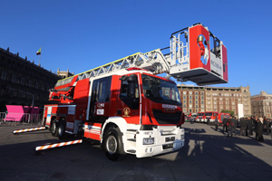 El Jefe de Gobierno, en compañía de la ministra de la Suprema Corte de Justicia de la Nación, Margarita Luna Ramos, subió a uno de los vehículos donados por BBVA Bancomer -el cual cuenta con una escala de 34 metros de altura, además de bomba y tanque-. La otra unidad tiene un alcance de 62 metros de altura y es considerada la más alta de América Latina.