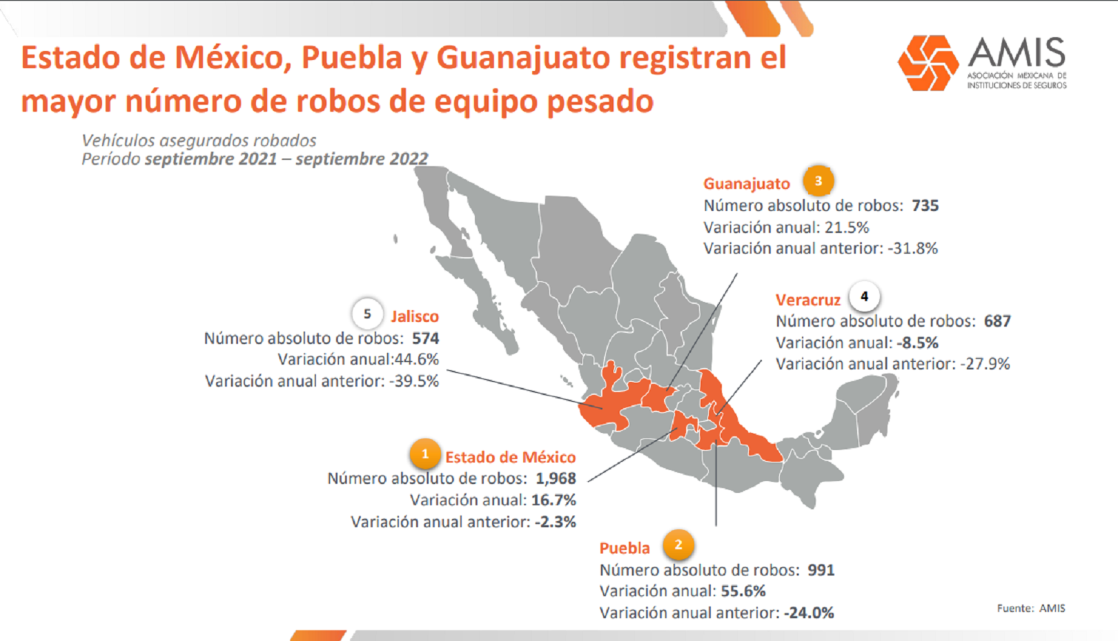 El mayor número de robos de equipo pesado asegurado se registró principalmente en: