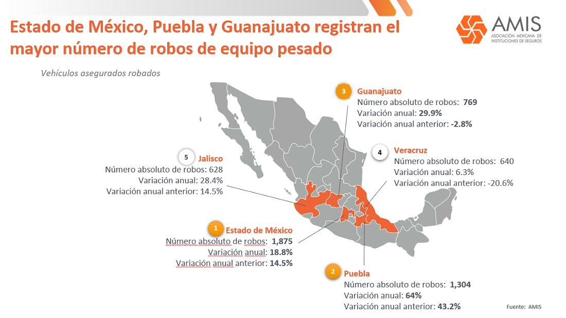 Los estados con el mayor robo de pesados asegurados son el Estado de México, Puebla y Guanajuato: