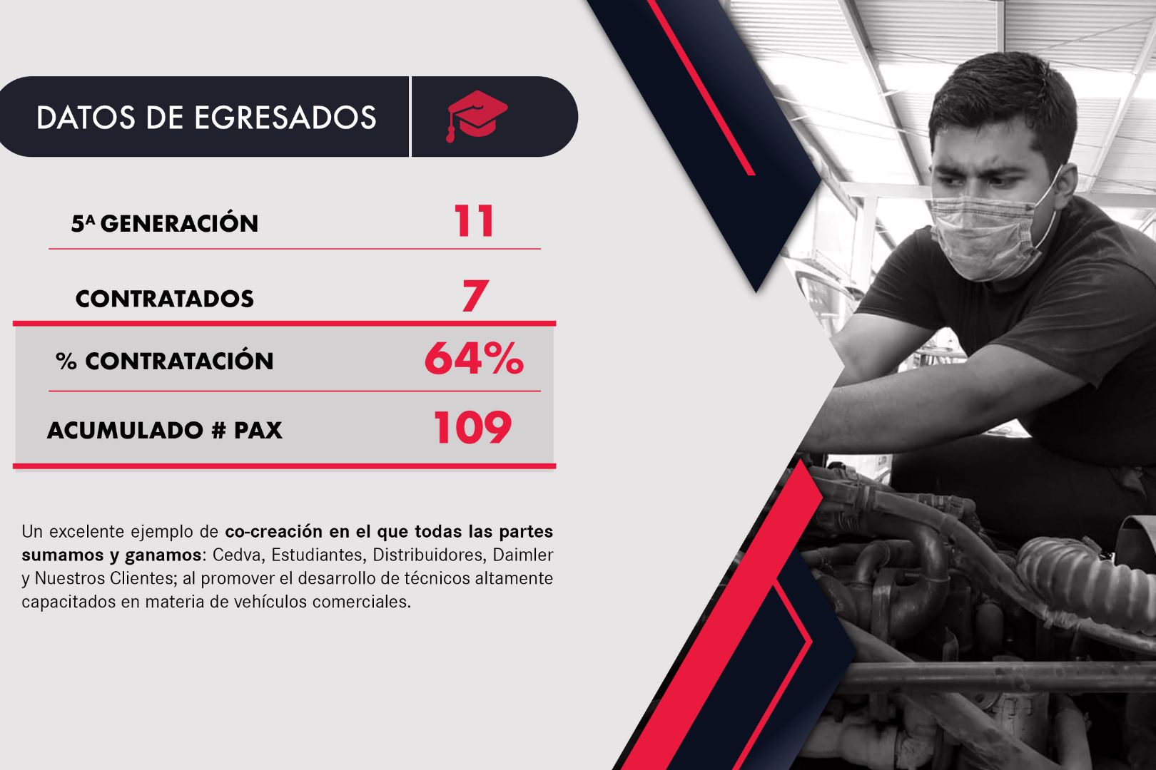 El programa Formación de Talentos busca contribuir al desarrollo de técnicos automotrices a diésel con la especialidad en vehículos comerciales. Su duración es de 6 meses donde alumnos de la carrera técnica de motores diésel o ingeniería automotriz del Instituto CEDVA, se especializa en su último semestre en materias especializadas en productos de Freightliner y Mercedes-Benz Autobuses.