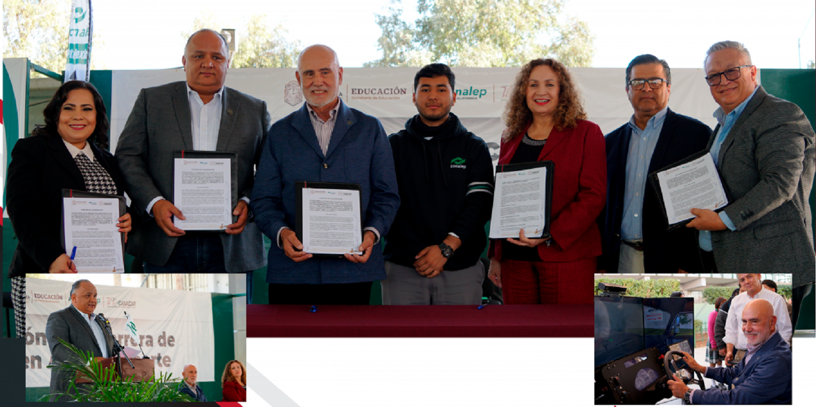 Ramón Medrano Ibarra, presidente nacional de la Cámara Nacional del Autotransporte de Carga (Canacar); Luciano Jiménez Laveaga, delegado de la cámara en Mexicali; Carlos A. Ayala Acosta, Director General Adjunto Comercial en Kenworth Mexicana y María Dolores Balderas, directora del Conalep Mexicali, firmaron un convenio de colaboración para iniciar en breve los cursos de la nueva Carrera de Técnico Bachiller en Autotransporte en el Plantel.