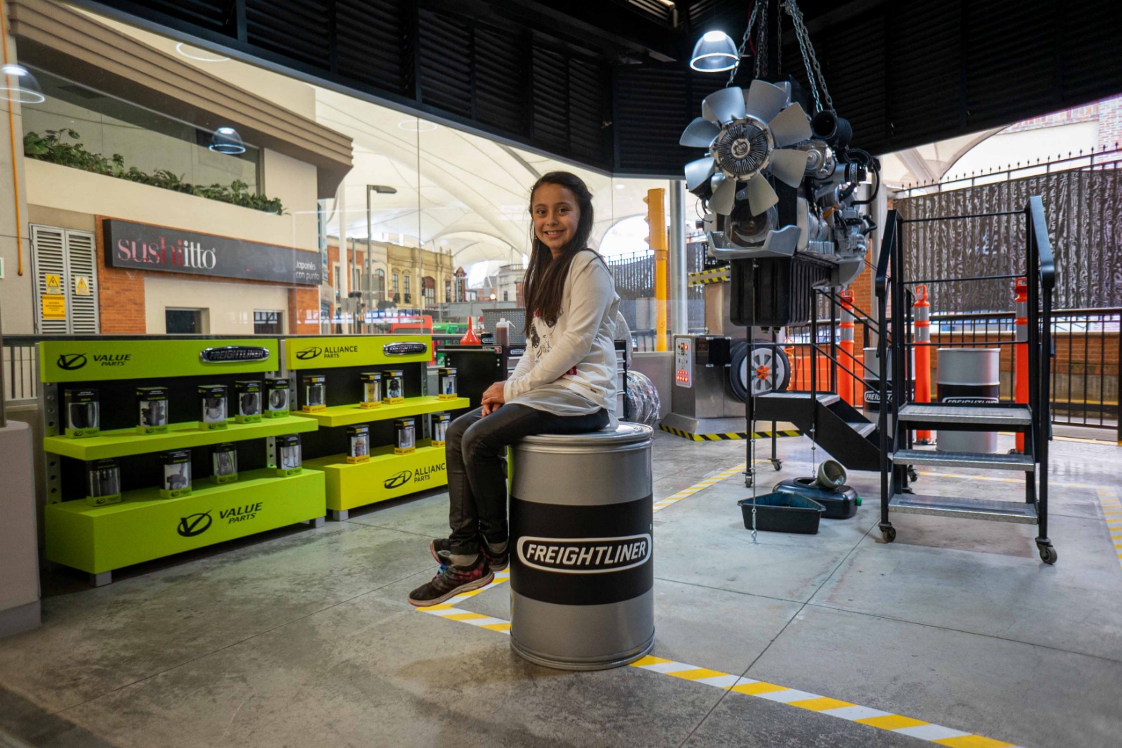 En este nuevo espacio de Freightliner los niños tienen la oportunidad de descubrir cómo funciona un taller mecánico para camiones y tractocamiones, así como conocer sus componentes y refacciones de la mano de Alliance Parts y Value Parts, que incluyen desde compresores, faros y amortiguadores hasta réplicas de motores.