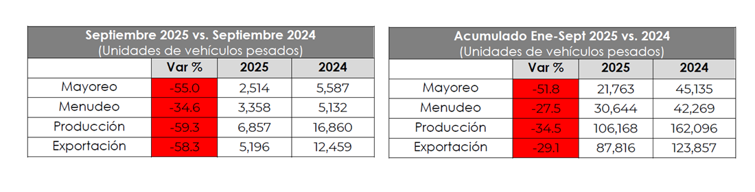 Por su parte, en el mercado externo, durante septiembre de 2025 se exportaron 5,196 unidades de vehículos pesados, mostrando una variación negativa de 58.3% respecto al mismo mes del año anterior. En el acumulado anual, las exportaciones totalizaron 87,816 unidades, lo que representa una disminución de 29.1% frente al mismo periodo de 2024.