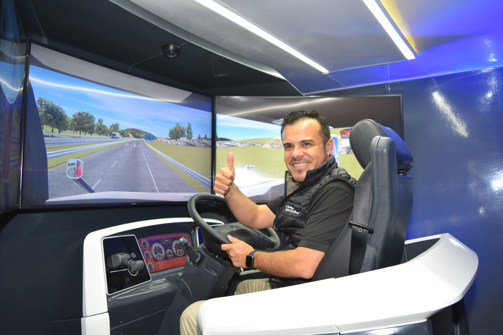 “Esta estrategia es muy innovadora, el remolque tiene en su interior diversos elementos para transmitir conocimiento y dar entrenamiento más específico sobre la operación de las unidades”. El remolque contiene un simulador para que los operadores prueben la experiencia de conducir un Cascadia o un M2.