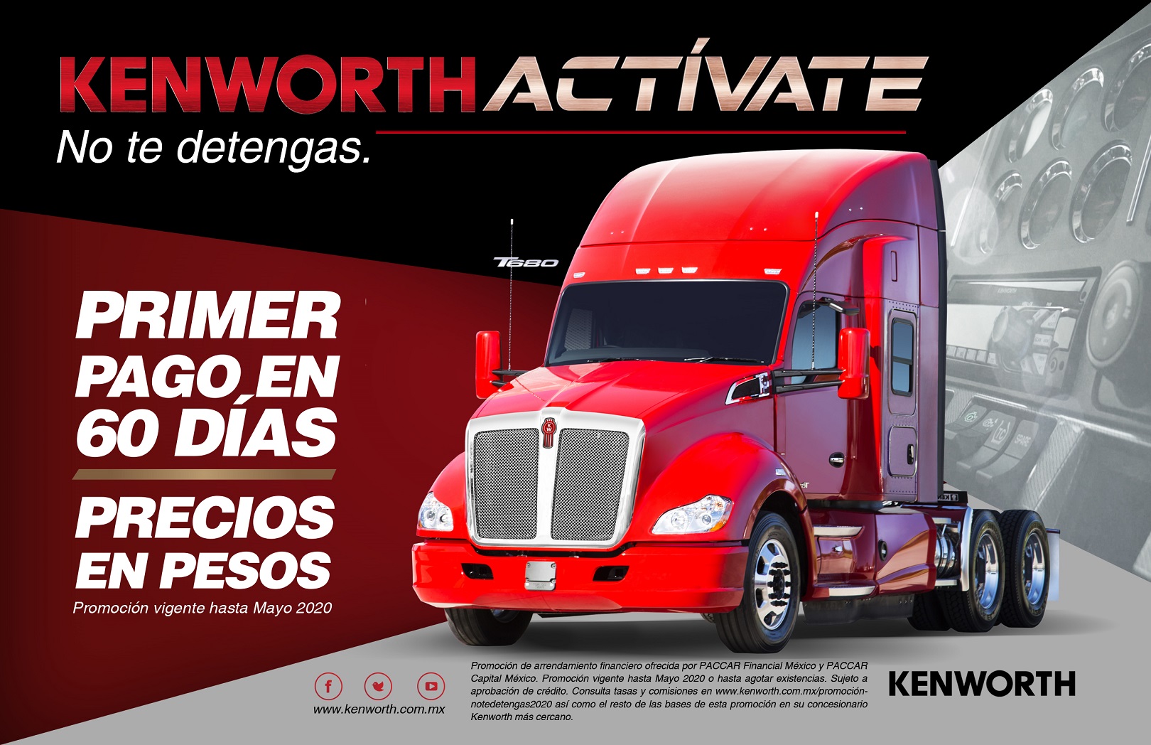 Bajo el lema de “Kenworth Actívate, no te detengas”, haciendo alusión a la compleja situación que se está viviendo derivada de la contingencia sanitaria, se ofrecen planes dentro de un esquema de arrendamiento financiero que varían de los 12 a los 60 meses con la posibilidad de gozar de un 0% de enganche con tasas de interés muy competitivas en el mercado. La promoción tiene vigencia hasta este 31 de mayo y está sujeta a aprobación crediticia.