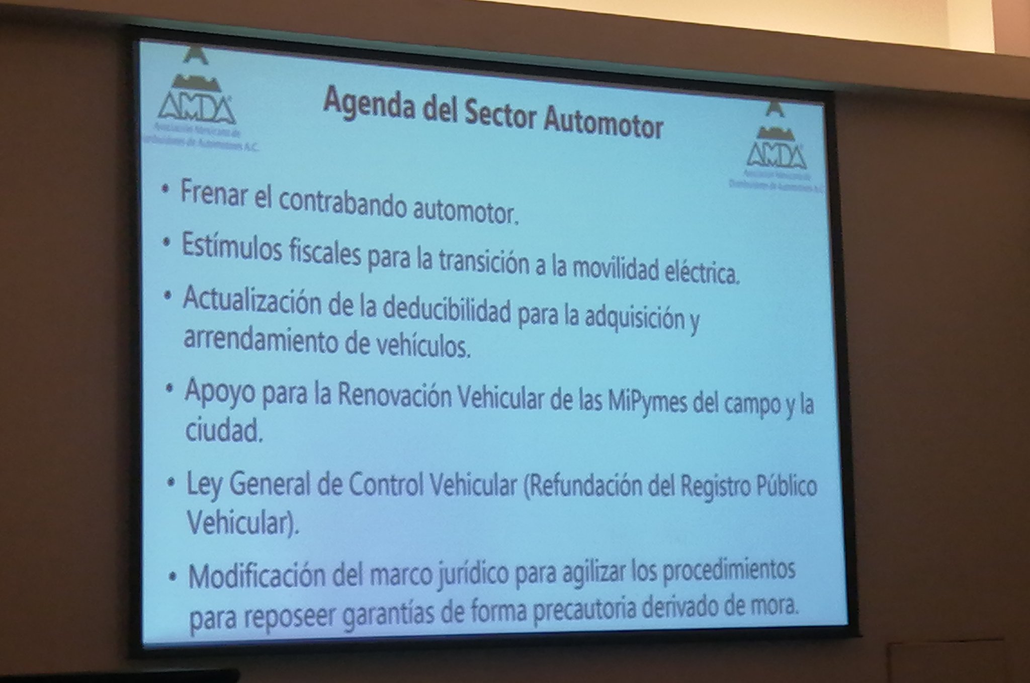 Por su parte, el presidente ejecutivo de la Asociación Mexicana de Distribuidores de Automotores (AMDA), Guillermo Rosales, destacó también pendientes para el sector de ligeros como: Frenar el contrabando automotor, estímulos para eléctricos, actualización de la deducibilidad para la adquisición y arrendamiento de vehículos, apoyo para la renovación vehicular de las MiPymes del campo y la ciudad, Ley General de Control Vehicular (Refundación del Repuve) y Modificación del marco jurídico para agilizar los procedimientos para reposeer garantías de forma precautoria derivado de mora.