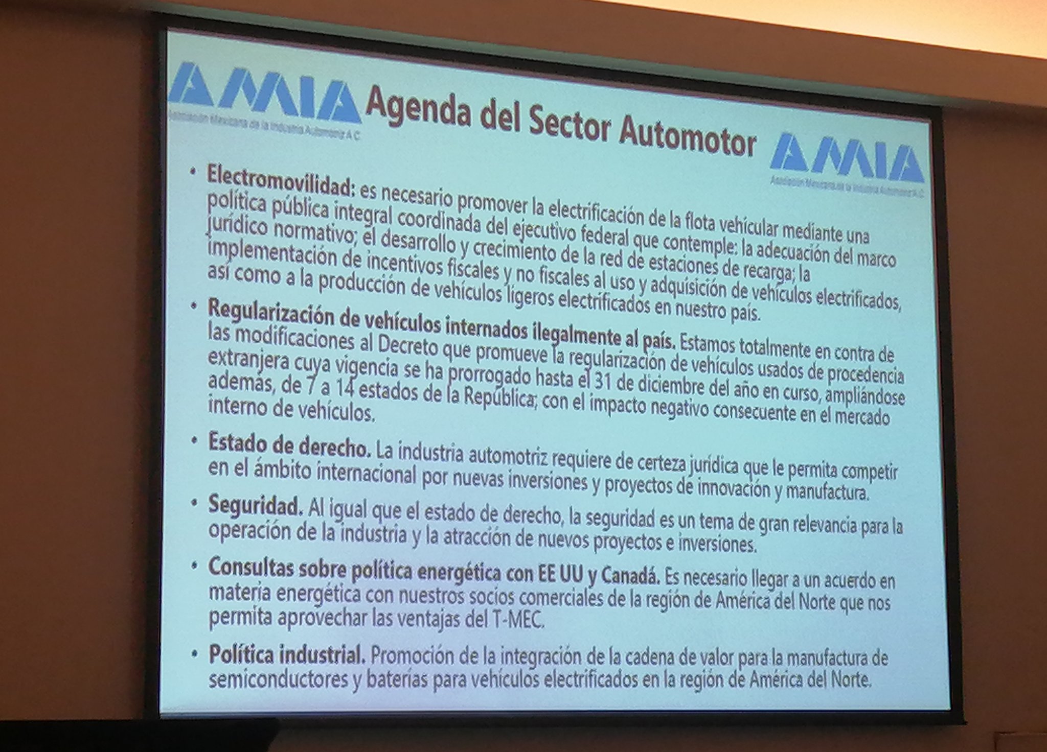 En tanto, el presidente de la Asociación Mexicana de la Industria Automotriz (AMIA), José Zozaya, destacó que “lo que más atrae la inversión es el respeto al Estado de Derecho”, en contraparte la inseguridad genera pérdida de competitividad como país y como región. “Se requiere además una política industrial que incluya la Electromovilidad, hacia allá va la tecnología y el mercado, con México o sin México”.