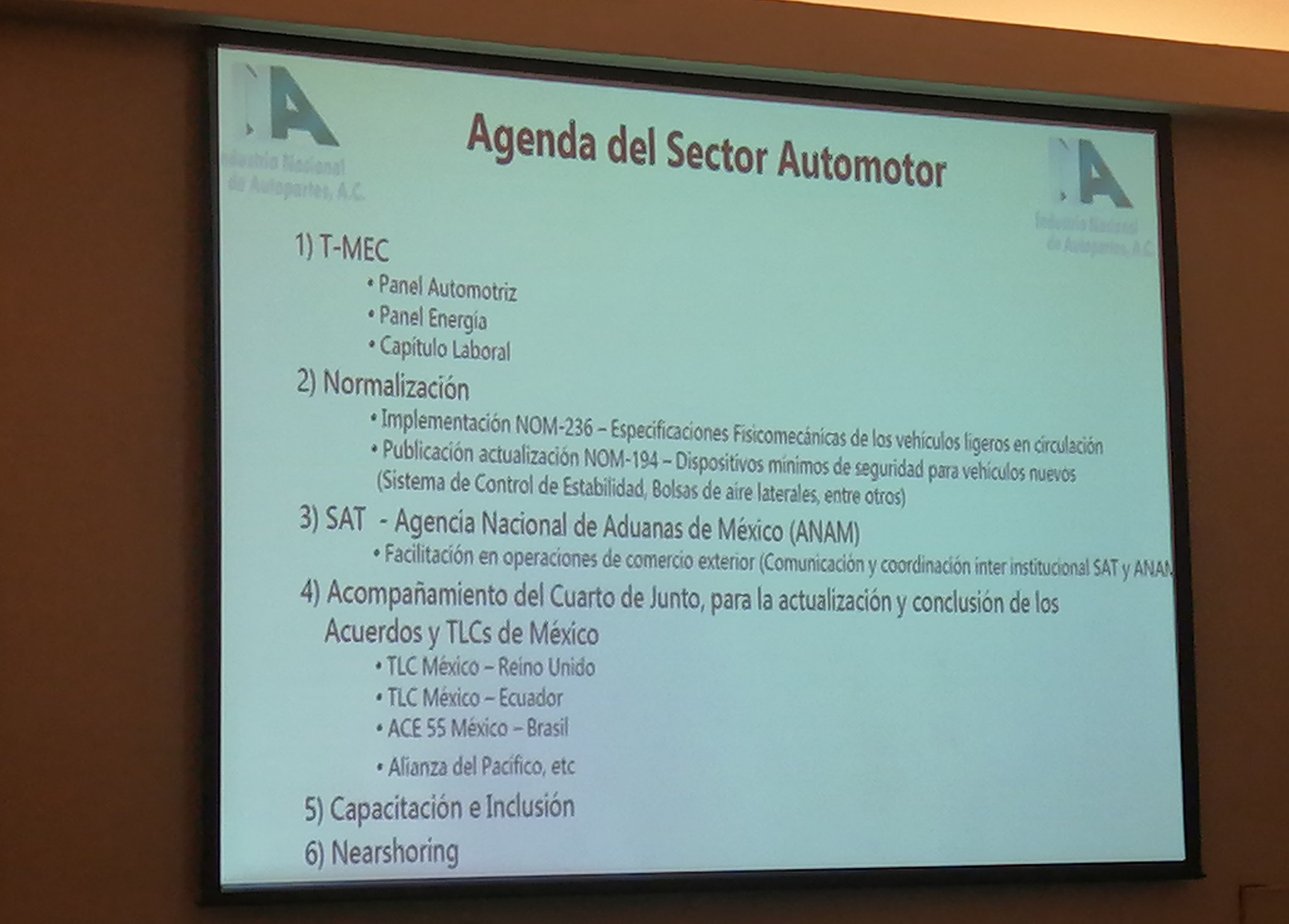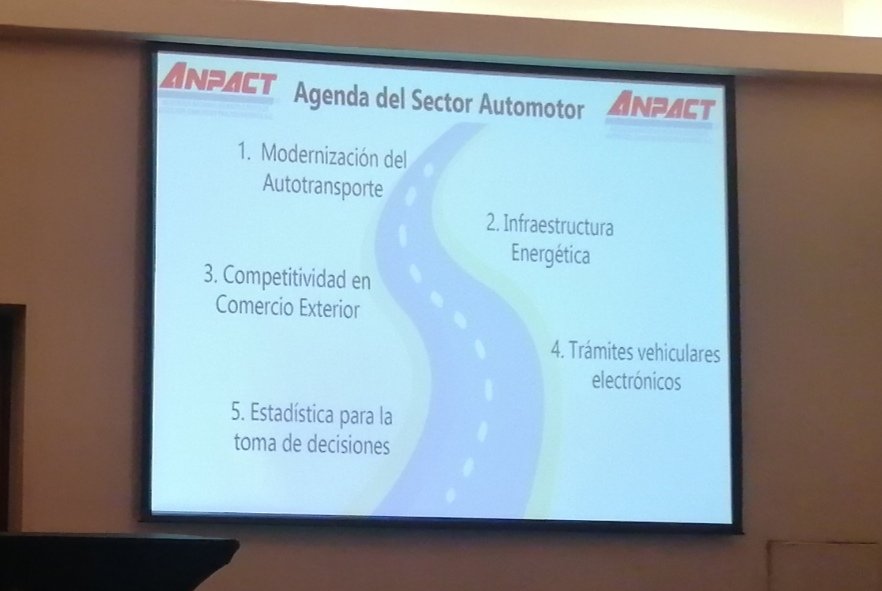 Las distintas asociaciones del sector automotor mexicano presentaron la agenda de temas pendientes a resolver. La ANPACT destacó en su lista particular los siguientes puntos: 1. Modernización del autotransporte, 2. Infraestructura energética, 3. Competitividad en comercio exterior, 4. Trámites vehiculares electrónicos y 5. Estadística para la toma de decisiones.