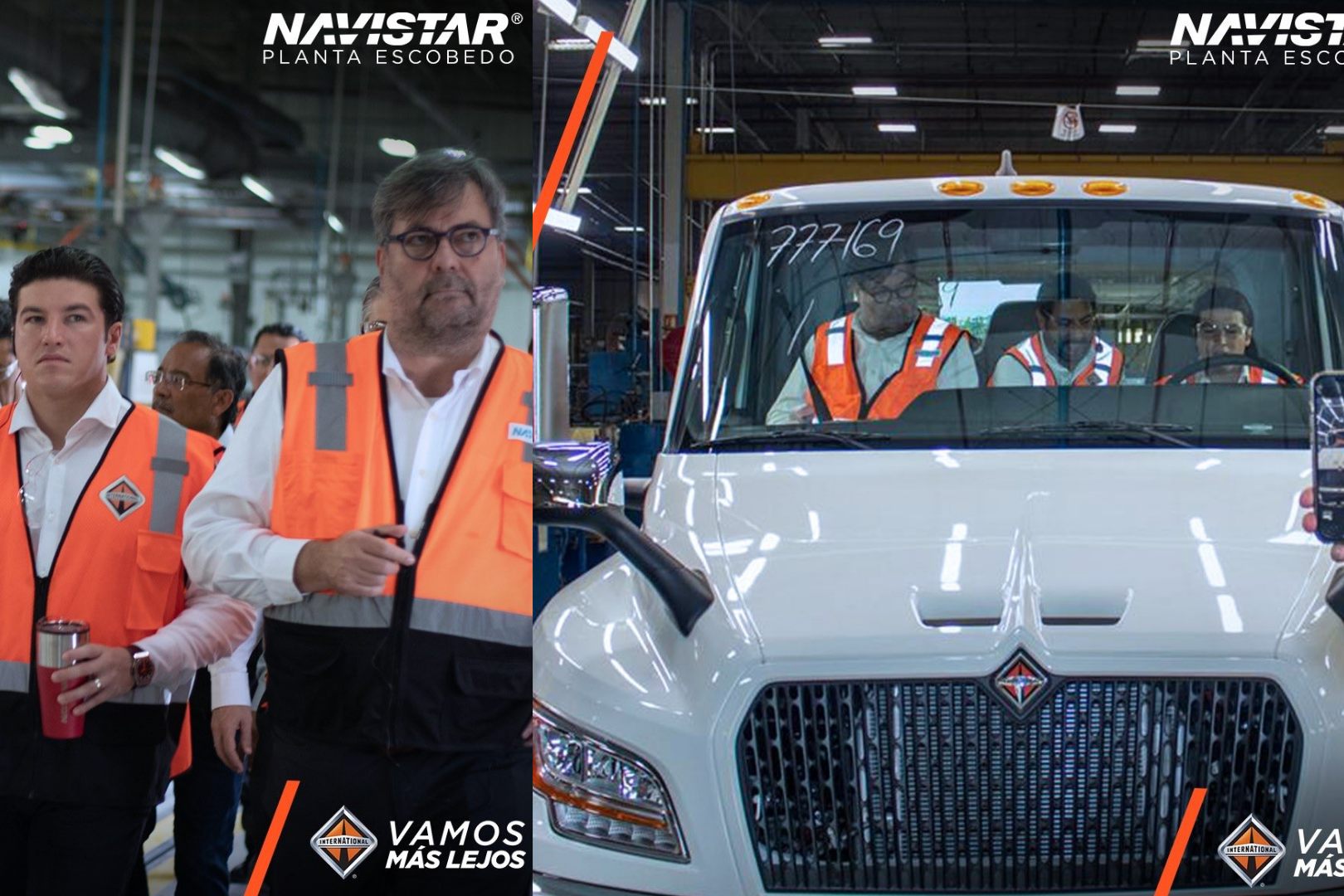 Autoridades del gobierno de Nuevo León y de Escobedo se dieron cita en Planta Escobedo para conocer las líneas dedicadas a la producción del camión eléctrico y la capacidad con la que cuentan estas instalaciones.
