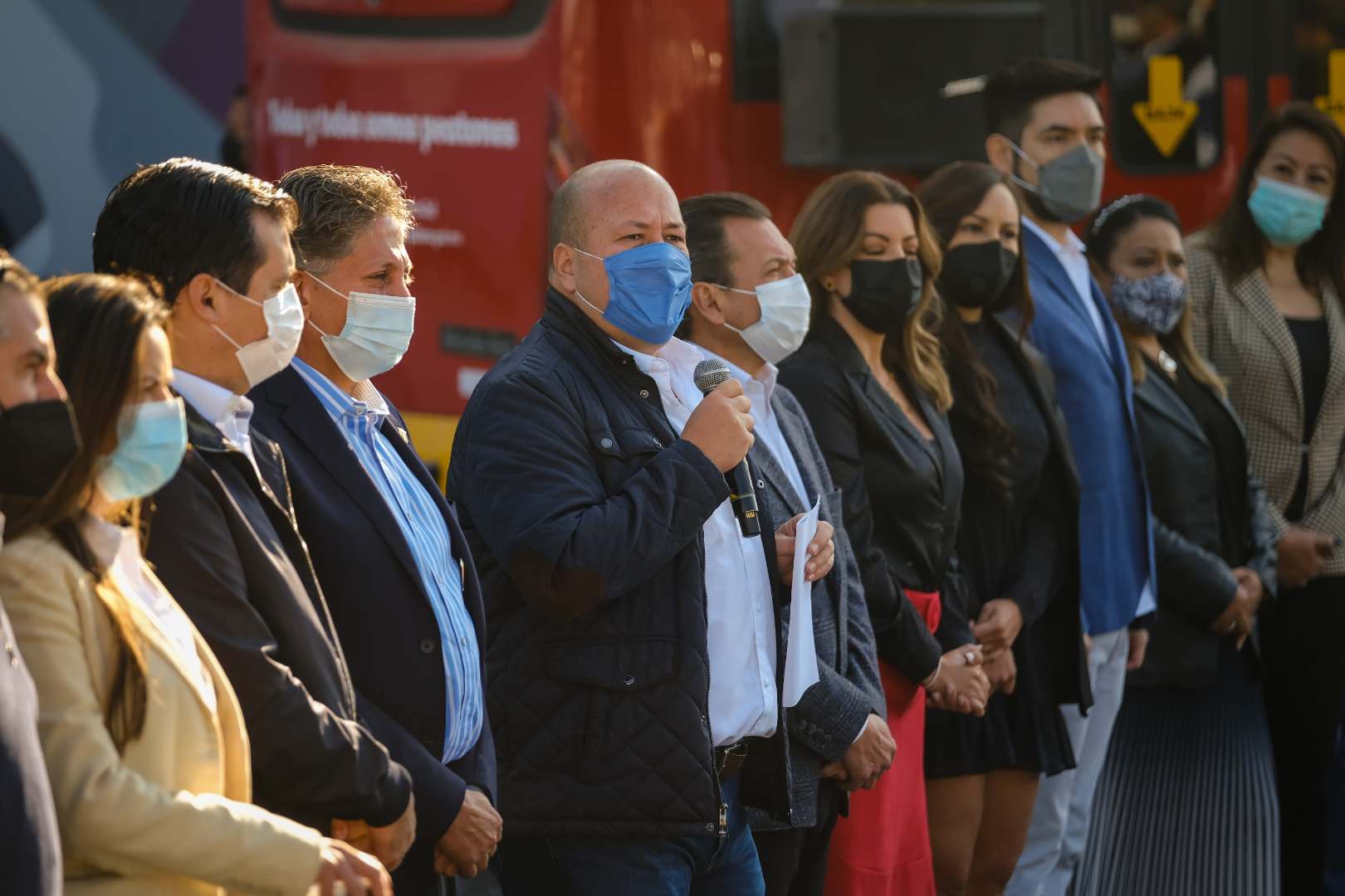 Al encabezar la presentación en la explanada del Estadio Akron, estas unidades forman parte del total de 984 camiones dentro de la primera fase de renovación de flota, programa gestionado por la Secretaría de Transporte (Setran) con una bolsa de 594 millones de pesos (mdp) de los cuales se han ejercido 460 millones. Gracias a la transparencia del proceso financiero se ha logrado el objetivo con un presupuesto menor.