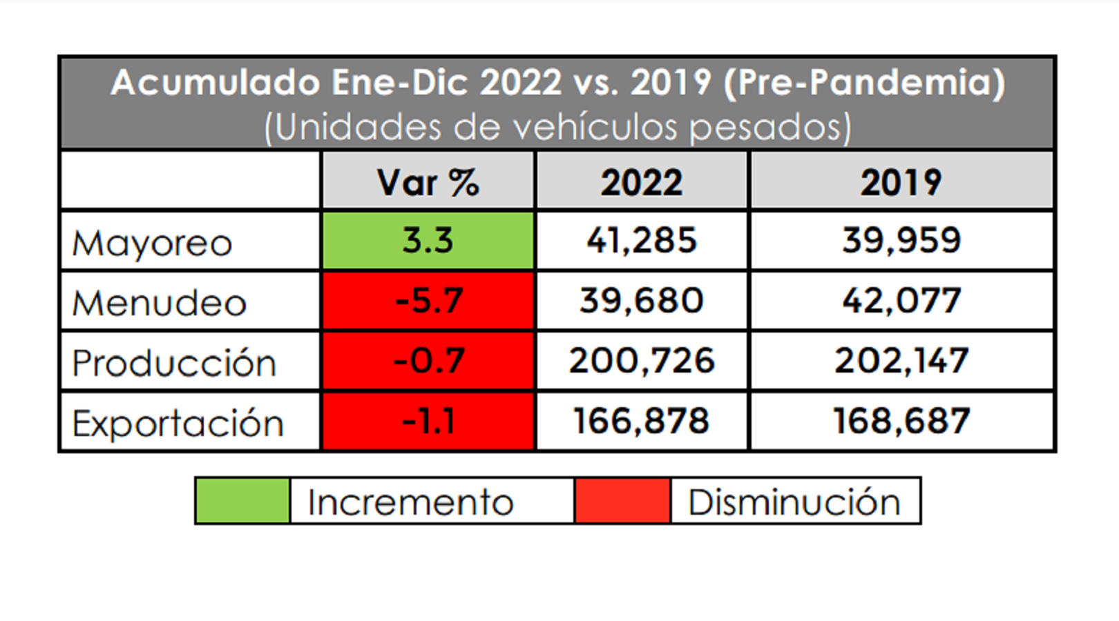 Las cifras acumuladas del 2022 estuvieron muy cerca de superar los niveles prepandemia de 2019 cuando se registraron 202,147 unidades en producción y 168,687 en exportación de pesados.