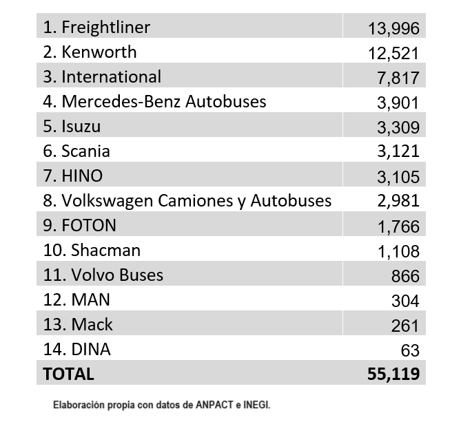 La marca que tiene la mayor cantidad de ventas en el mercado doméstico es Freightliner de Daimler Truck, con 13,996 unidades, seguida por Kenworth con 12,521 unidades, dichas marcas tienen en conjunto prácticamente el 50% del mercado nacional.