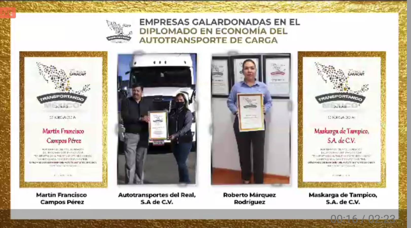 En la ceremonia de entrega por internet, también la International Road Transport Union (The IRU por sus siglas en inglés), galardonó a 10 directivos de empresas transportistas por sus acciones destacadas.