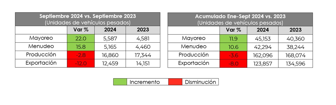 Asimismo, el presidente de ANPACT detalló que la producción de vehículos pesados totalizó con 16,860 unidades en los 30 días de septiembre y con 162,096 unidades en lo referente a los nueve meses concluidos, lo que significó bajas de 2.8% y 3.6%, respectivamente.