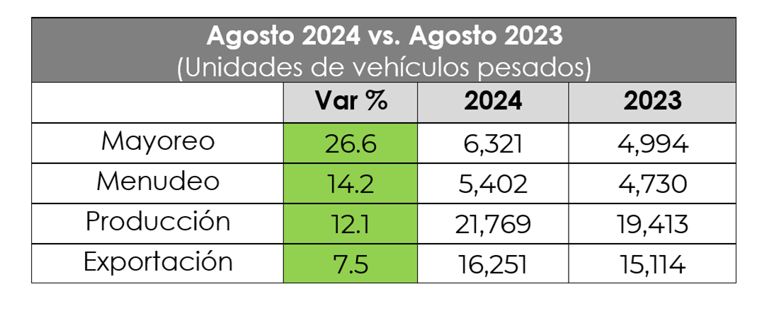 Las ventas al mayoreo de vehículos pesados aumentaron a doble dígito durante agosto, con relación al mismo lapso del año anterior, informó el presidente ejecutivo de la Asociación Nacional de Productores de Autobuses, Camiones y Tractocamiones (ANPACT), Rogelio Arzate.