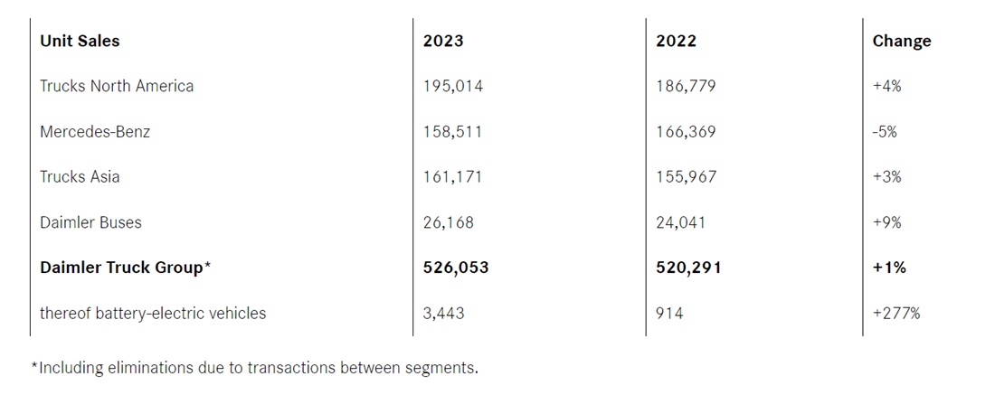 Daimler Truck volvió a aumentar en 2023 sus ventas de unidades pesadas en todo el mundo, a pesar de los cuellos de botella en el suministro en importantes regiones. En 2023 vendieron en total 526 mil 053 camiones y autobuses, en comparación con 2022 cuando colocaron 520 mil 291 unidades. La Compañía ha comercializado 3 mil 443 unidades de vehículos eléctricos de batería, un 277% más que el año anterior (914 unidades).
