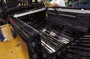 General Motors begins production of the 2009 HUMMER H3T Friday, September 5, at the Shreveport Assembly Plant in Shreveport, Louisiana. Members of UAW Local 2166 assemble the H3T, the first midsize pick-up truck from HUMMER that carves out a new niche in the truck market, combining the versatility of a midsize crew cab truck with the capability and unique design of a HUMMER. The H3T will be sold in North America, the Middle East and select European countries. (Photo by Mike Stone for General Motors) (United States)