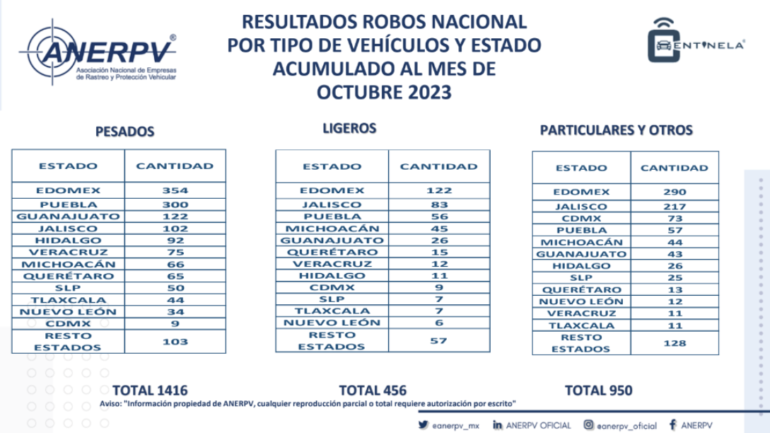 La Asociación Nacional de Empresas de Rastreo y Protección Vehicular (ANERPV) informó que durante los diez meses del presente año sus asociados reportaron 2 mil 822 robos de unidades en las carreteras de todo el país.