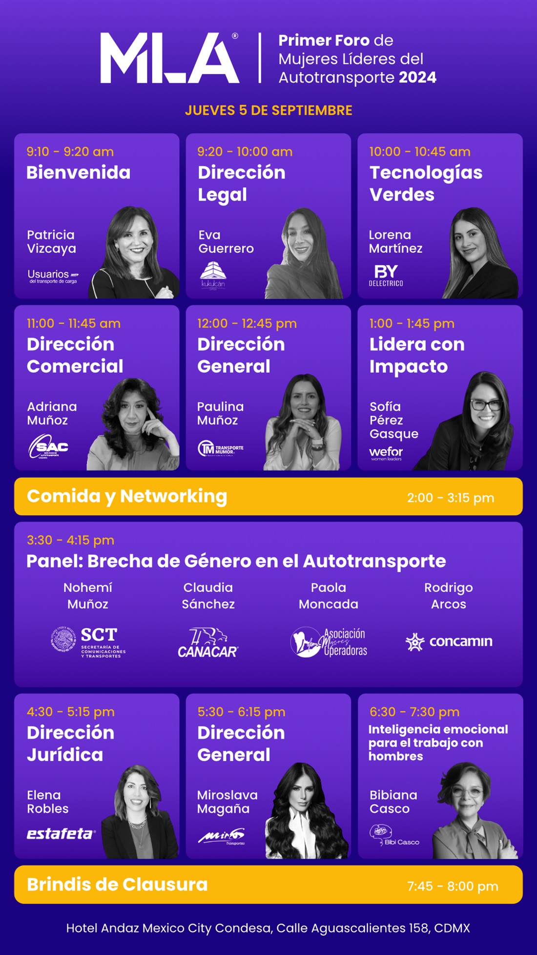 Será un día de trabajo interesante, donde podrán conocer los puntos de vista y experiencias de Mujeres como Lorena Martínez, Directora de BYD Electrico, hablando de Tecnologías Verdes; Elena Robles de Estafeta, en la parte Jurídica; Bibiana Casco con una charla de Inteligencia Emocional; Miroslava Magaña, Directora de Miros Transportes para hablar de Dirección, entre otras más.
