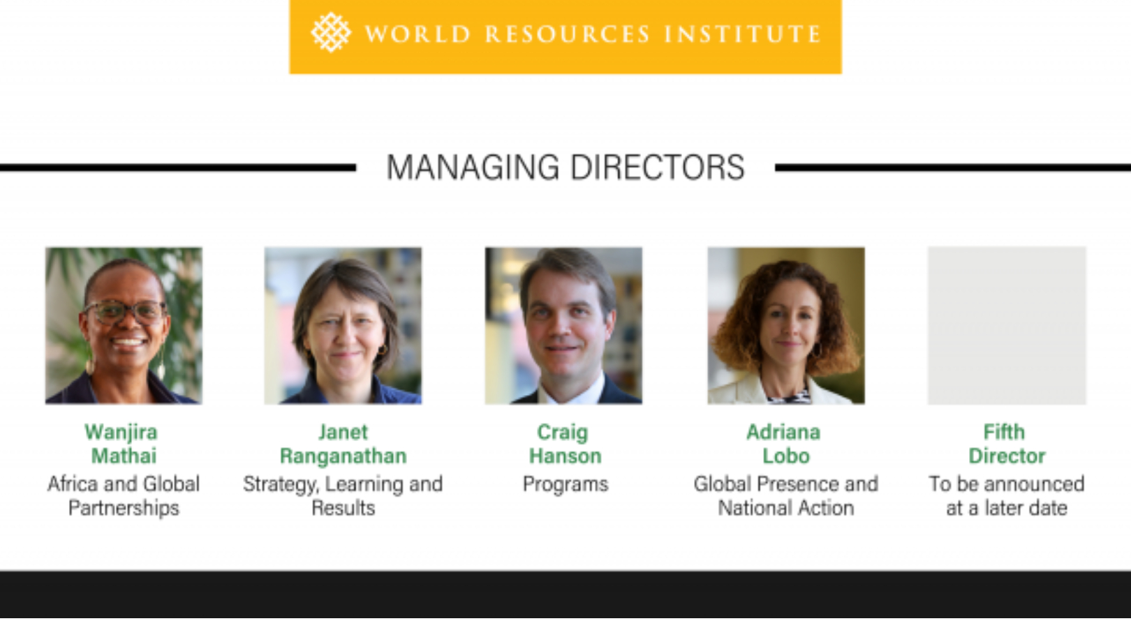 El nuevo equipo refleja la amplia experiencia y el alcance global del instituto y está conformado por Wanjira Mathai, directora general para África y asociaciones globales, Janet Ranganathan, directora general de estrategia, aprendizaje y resultados, y Craig Hanson, director general de programas.