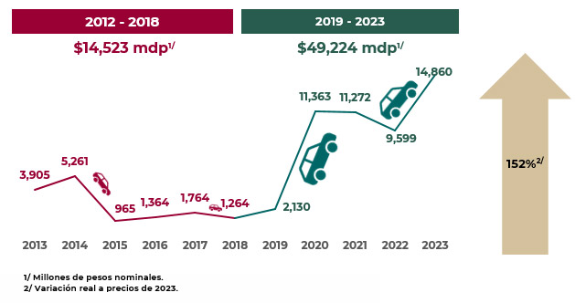 Durante el periodo 2019-2023, el Servicio de Administración Tributaria (SAT) ha logrado recaudar 49,224 millones de pesos (mdp) a grandes contribuyentes de la industria automotriz, esta cifra representa un incremento del 152% en términos reales, con respecto al periodo 2012-2018.