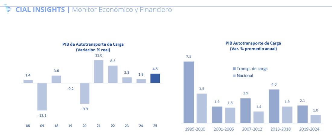 “En la coyuntura reciente, los ingresos reales de este sector parece que empiezan a mostrar cierta mejoría, tras un estancamiento en 2023. El autotransporte de carga general creció 8.1% anual en febrero, dejando atrás su caída de 9.6% de 2023. Por su parte, el autotransporte de carga especializada repuntó 19.7% en febrero, extendiendo su buen desempeño de los años recientes: 8.4% en 2022 y 5.2% en 2023.