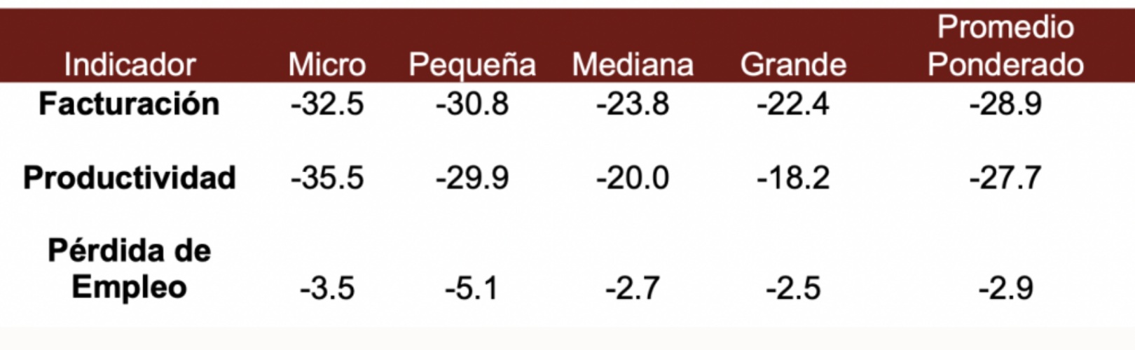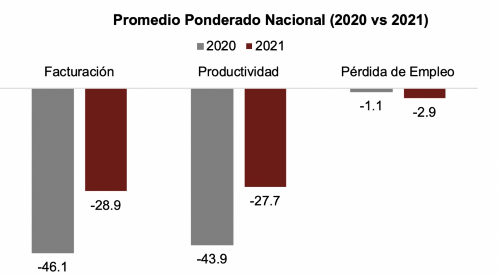 Al comparar los indicadores del año 2021 contra los datos de 2020, se observa un detrimento menor en materia de facturación y productividad en las empresas, pero la pérdida de empleo es mayor durante el año 2021.
