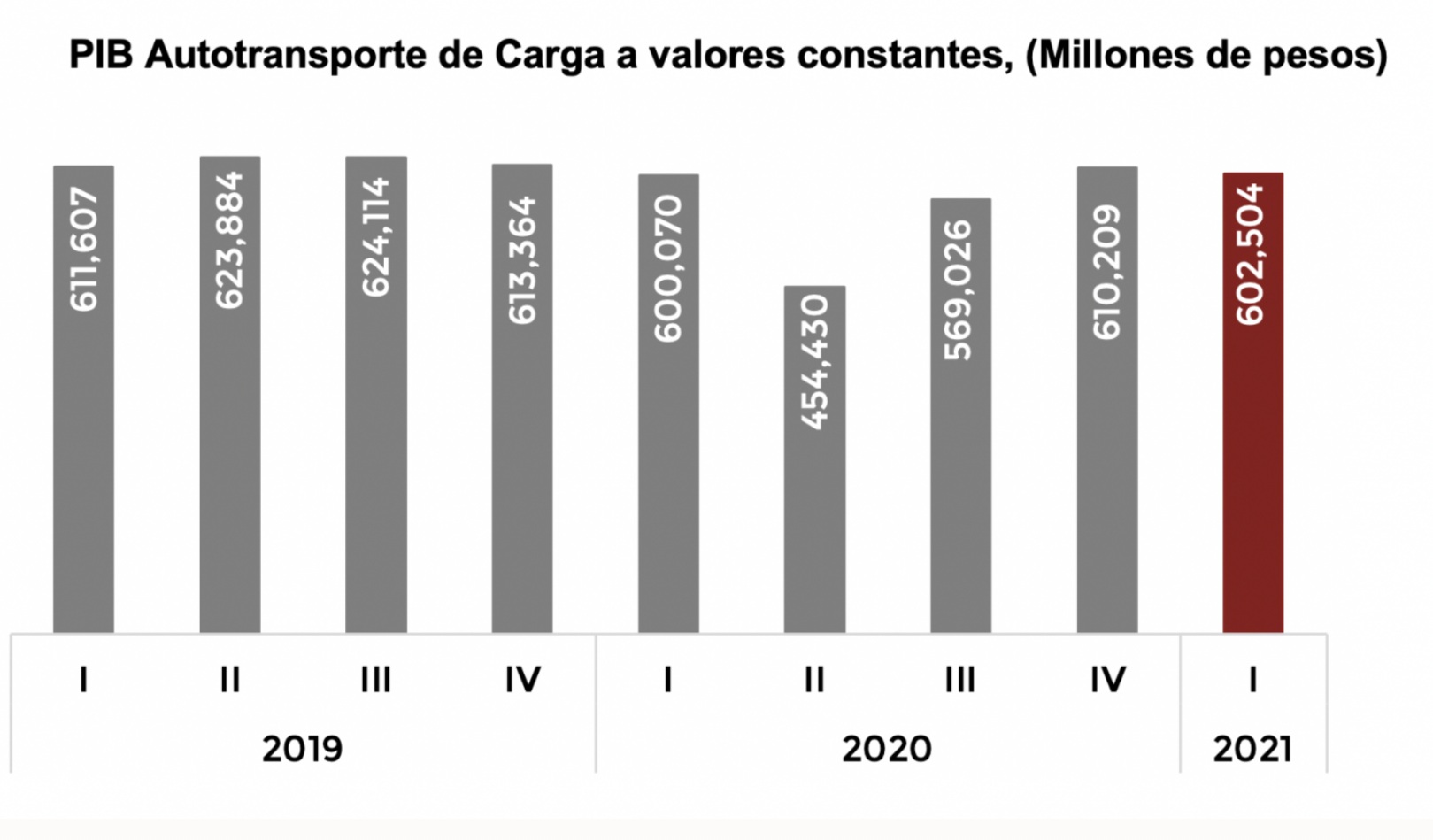 Como se muestra en la siguiente gráfica, hasta antes de la pandemia, la tendencia de crecimiento del PIB del sector iba por buen rumbo. En el primer trimestre de 2020 se ubicó en 611.6 mil millones de pesos; sin embargo, en el segundo trimestre del año 2020, el autotransporte de carga registro su menor nivel, consecuencia de los efectos de la pandemia al totalizar tan solo 454.4 mil millones de pesos.