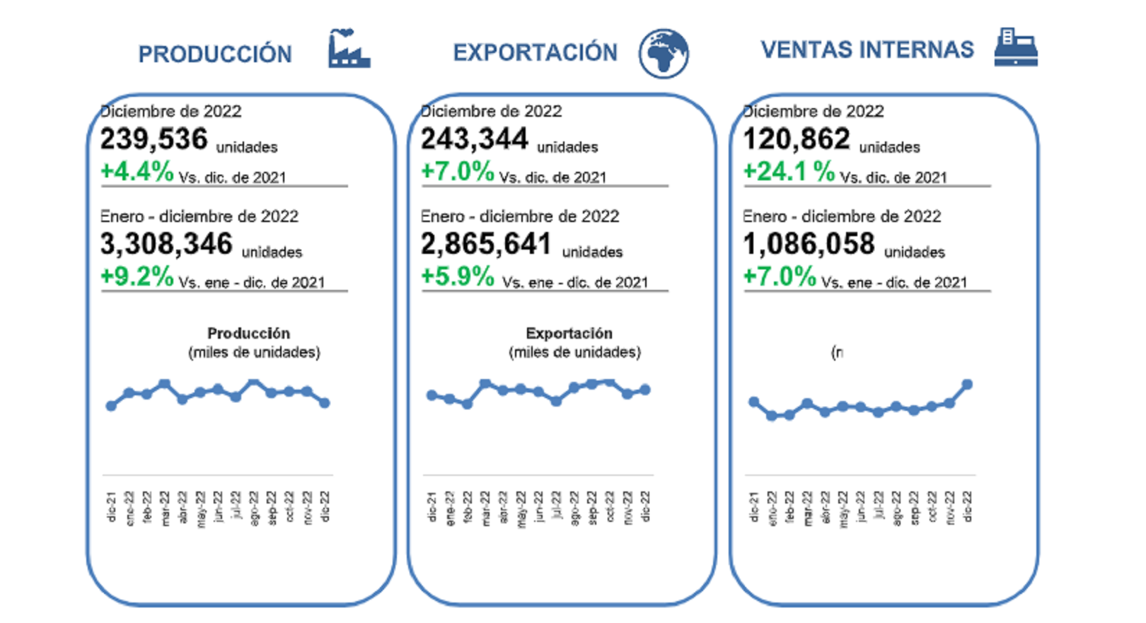 De acuerdo con la Asociación Mexicana de la Industria Automotriz (AMIA), al cierre del 2022 se registró una producción anual mayor que en 2021 en 9.2%, mientras que para este 2023 se estima un aumento de 6.6% contra el 2022. En cuanto a las exportaciones, se tuvo un cierre anual con un crecimiento de 5.9%, y para 2023, se espera un incremento de 7.2% con respecto al año anterior. Por lo que hace a las ventas domésticas de vehículos ligeros se incrementaron 7.0% al cierre de 2022 y se espera un crecimiento de 5.4%% para 2023.