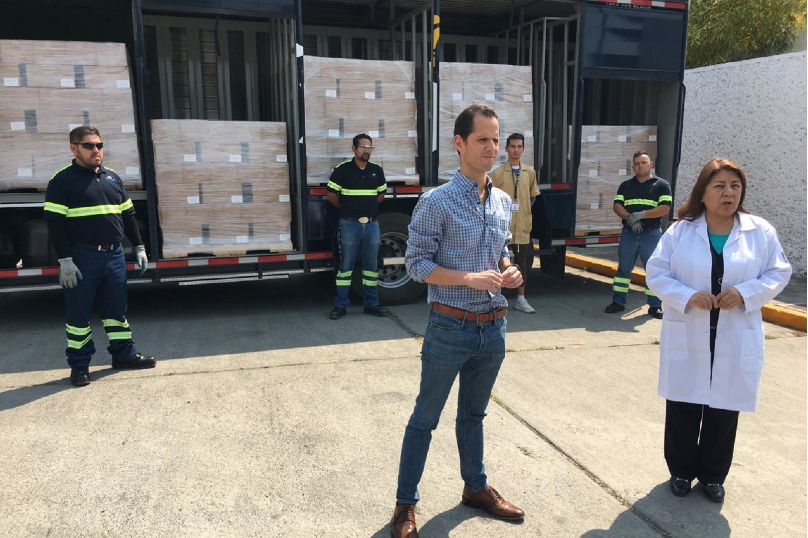 Esta donación fue posible gracias a la mediación de la Fundación IMSS y se realizó en el Almacén Central de Vallejo, a donde llegaron los insumos para que se inicie su entrega en las 35 Oficinas de Representación del Seguro Social en la República Mexicana.