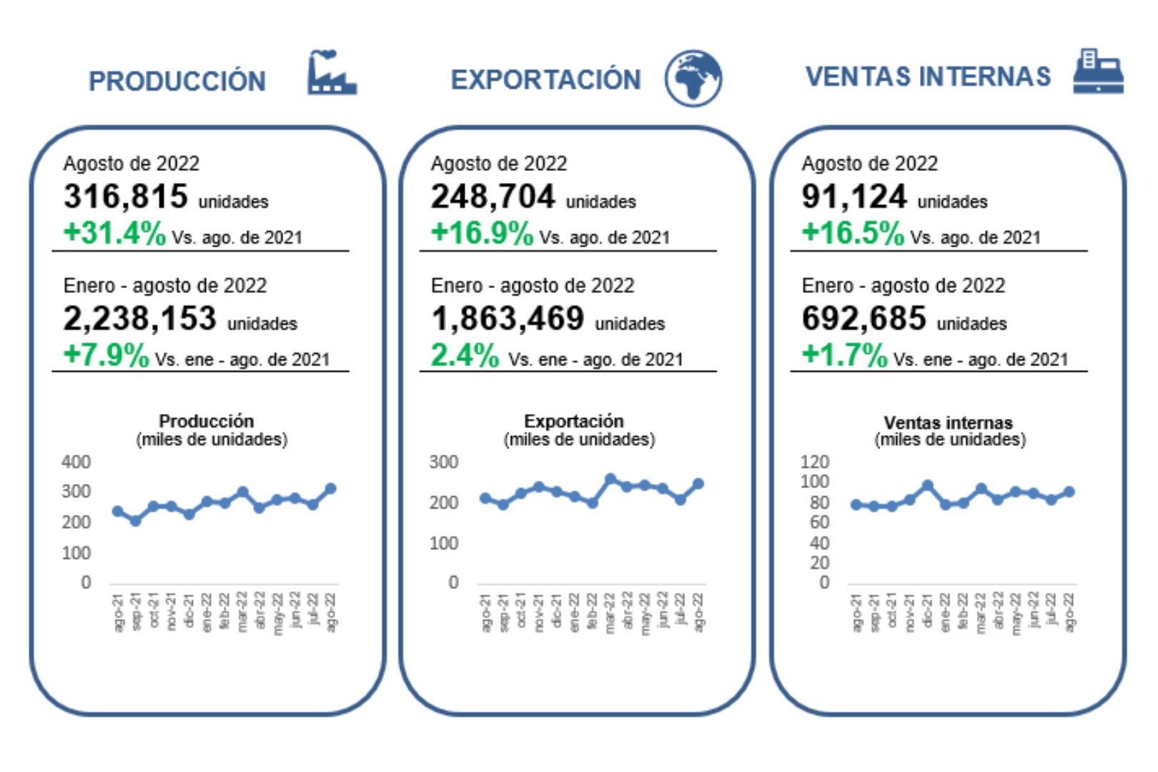La producción y exportación mexicana de vehículos ligeros registraron crecimientos a doble dígito en agosto de 2022. La industria continúa superando los desafíos en las cadenas de suministro globales. Asimismo, la creciente incertidumbre económica y la inflación persistente moderan la demanda de los consumidores en los mercados de destino de las exportaciones.