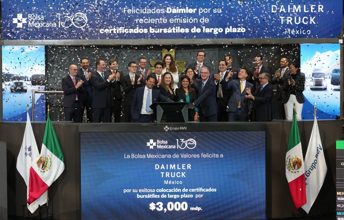 Daimler México, empresa de servicios de tesorería e impuestos del grupo Daimler Truck México, concluyó con éxito la colocación de su nueva emisión de bonos corporativos listada en la Bolsa Mexicana de Valores (BMV), alcanzando un monto total de MXN 3,000 millones, con una sobresuscripción de 2.02 veces sobre el objetivo inicial.