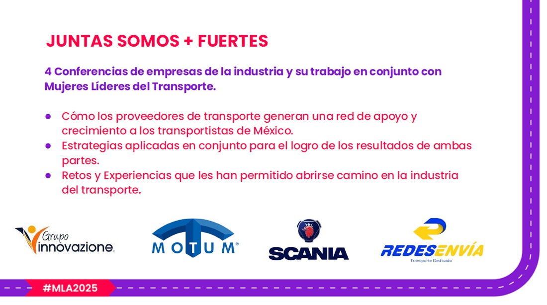 Con el slogan “Juntas somos + Fuertes” la dinámica de las conferencias que se expondrán van a mostrar el trabajo conjunto entre alguna de las empresas aliadas ya confirmadas como Tecnomotum, Grupo Innovazione, Redes Envía y Scania; que presentarán las estrategias, retos y buenas prácticas que han llevado de la mano de alguno de sus clientes para el cumplimiento de los objetivos de ambos.
