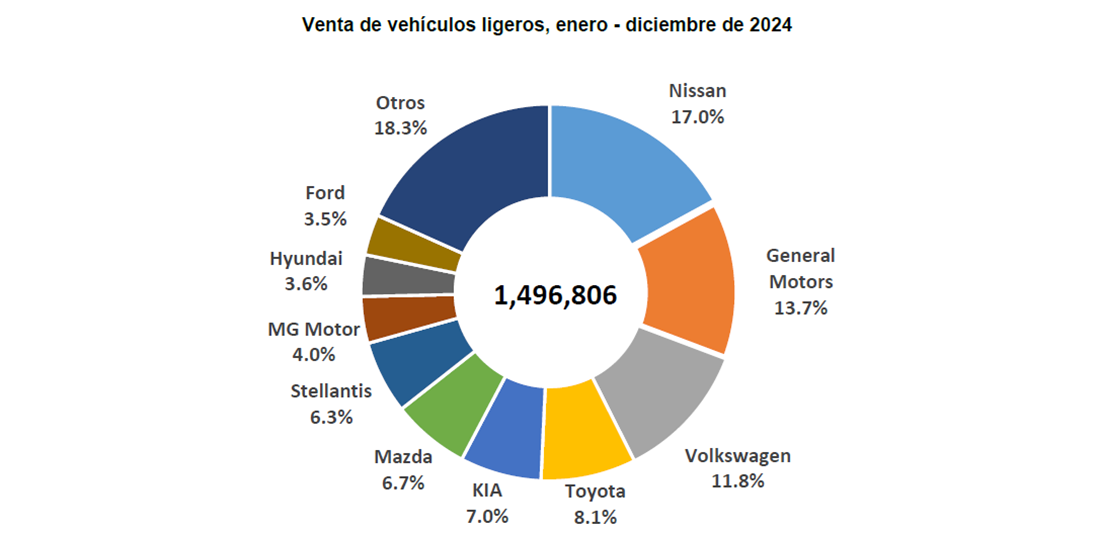 En el periodo enero-diciembre de 2024 se registraron 1,496,806 vehículos ligeros nuevos vendidos, lo que representa un incremento de 9.8% con respecto a lo reportado durante el mismo periodo de 2023.