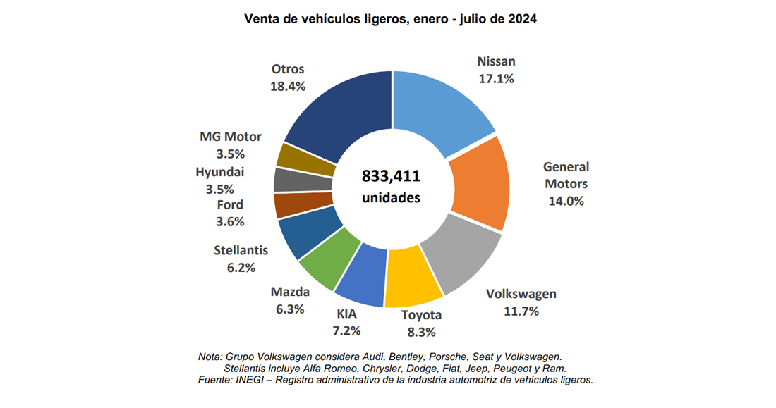Asimismo, en el periodo enero-julio de 2024 se registraron 833,411 vehículos ligeros nuevos vendidos, lo que representa un incremento de 12.0% con respecto a lo reportado durante el mismo periodo de 2023.