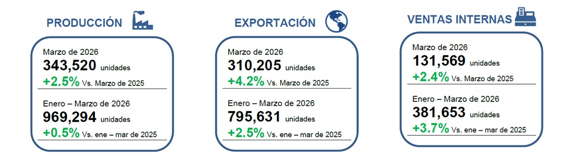 Durante marzo de 2026, la producción de vehículos ligeros en México alcanzó 343,520 unidades, lo que representa un crecimiento de 2.5% en comparación con marzo de 2025. Cabe destacar que el acumulado del primer trimestre de 2026 se posiciona como el segundo mejor de toda la serie histórica, con una producción de 969,294 (el primero fue 2019), lo que equivale a un crecimiento de 0.5% respecto al mismo periodo de 2025.